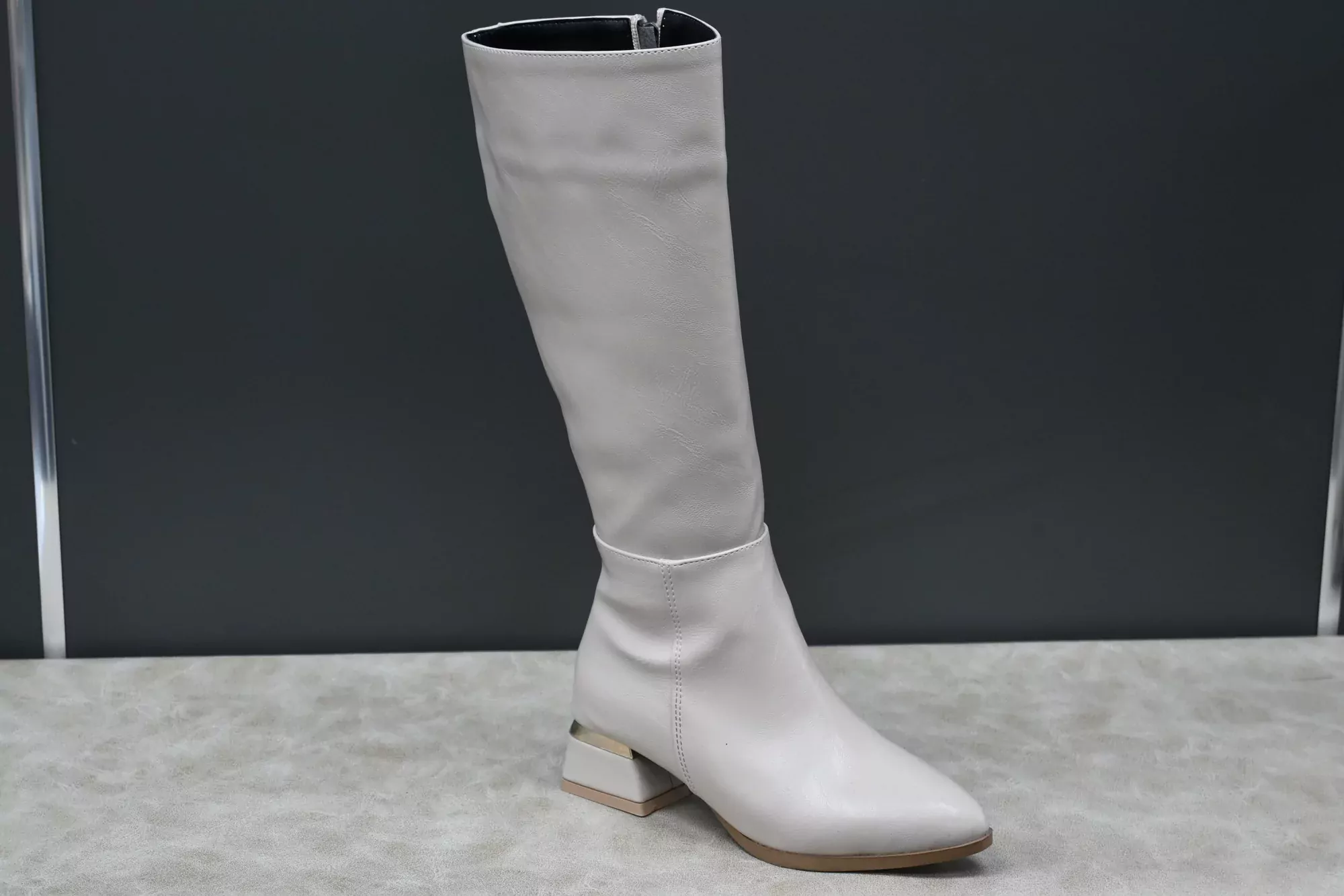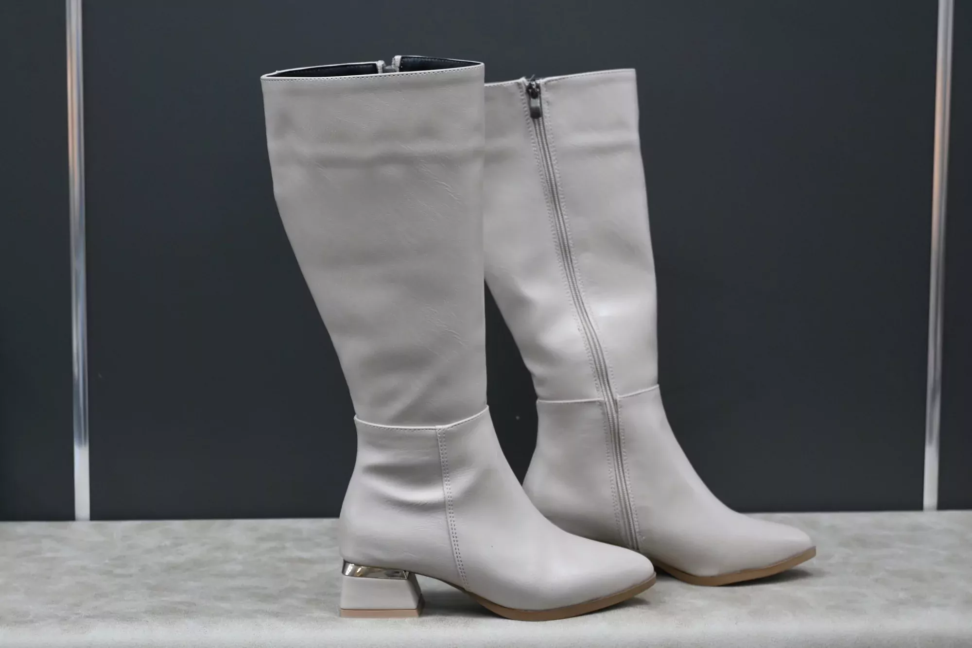 Rosmarin Kadın Bej Deri Sivri Burun Uzun Fermuarlı Kışlık Çizme